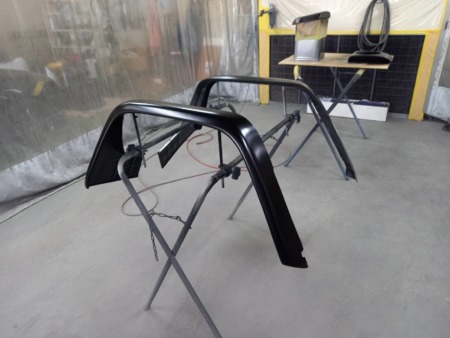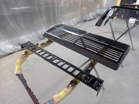 ▼ 取り換えのためのフロントグリルやオーバーフェンダーのマットブラック塗装を施します。