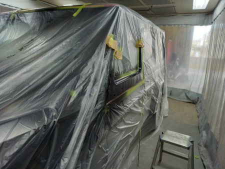 ▼ 純正ミラー穴埋め作業が終わったピラーの塗装をします。