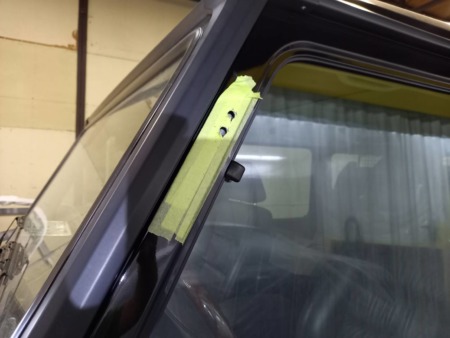 ▼ ドアミラーを純正からトラックミラーへ交換の為純正ミラー取り付け用穴埋めとトラックミラー取り付け用穴あけ作業を行います。